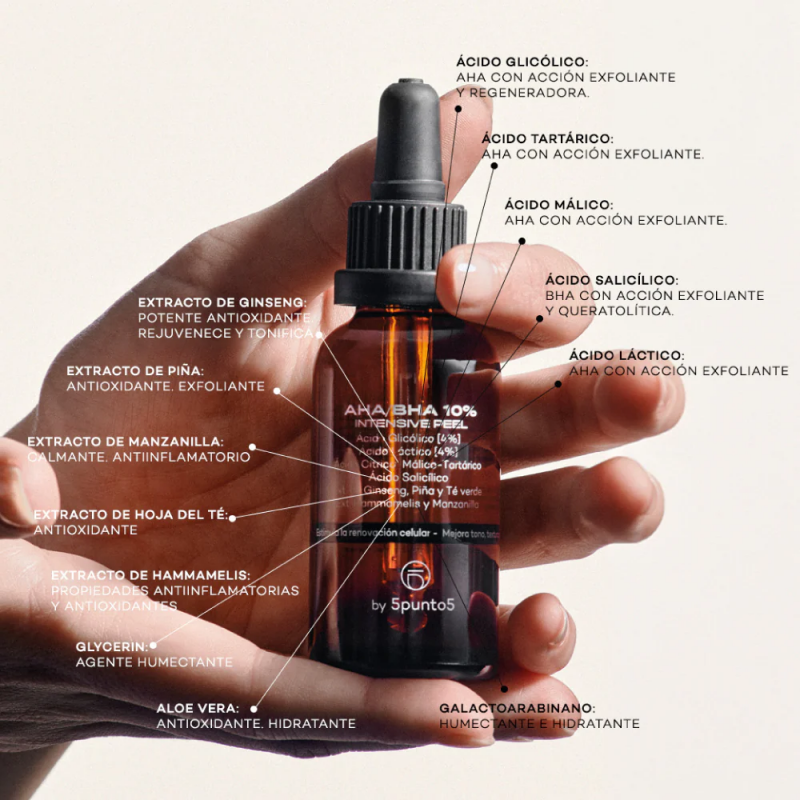 Más información5PUNTO5 AHA/BHA 10% INTENSIVE PEEL SERUM 30ML es un sérum altamente concentrado diseñado para proporcionar una exfoliación intensiva que mejora visiblemente la textura de la piel, minimiza las imperfecciones y unifica el tono. Formulado con una potente combinación de ácidos AHA (Alfa-Hidroxiácidos) y BHA (Beta-Hidroxiácidos), este sérum actúa en las capas más superficiales y profundas de la piel, eliminando las células muertas, desobstruyendo los poros y promoviendo la regeneración celular.