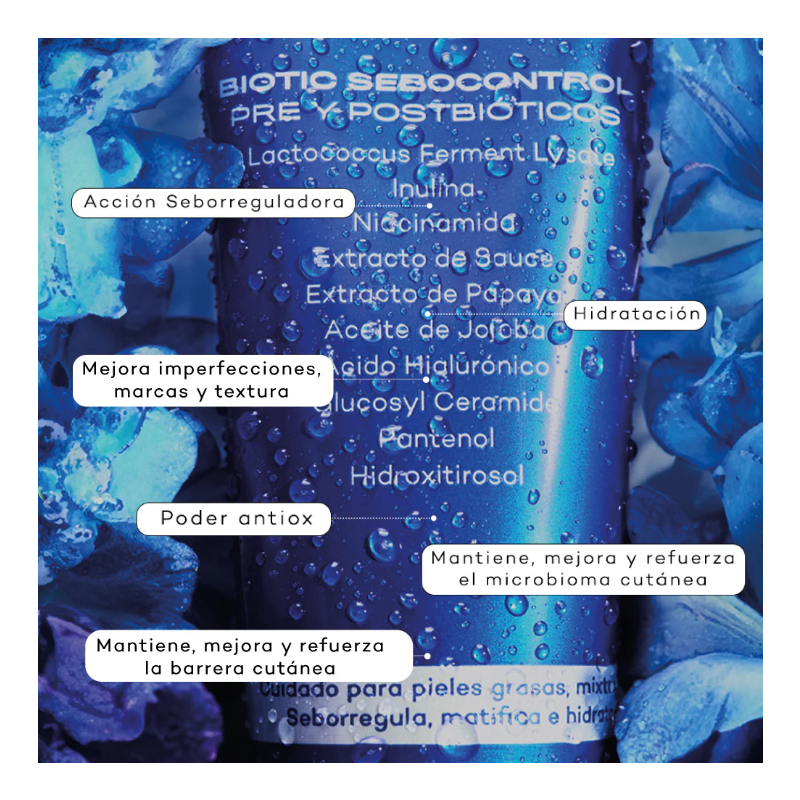 Biotic Sebocontrol es una crema de uso diario con textura ligera para pieles mixtas/grasas que contiene pre y postbioticos además de otros principios activos potentes como backuhiol, niacinamida, papaya, extracto de sauce y aceite de jojoba para ayudar a equilibrar la producción de sebo, disminuir poros e imperfecciones mejorando la textura de la piel.