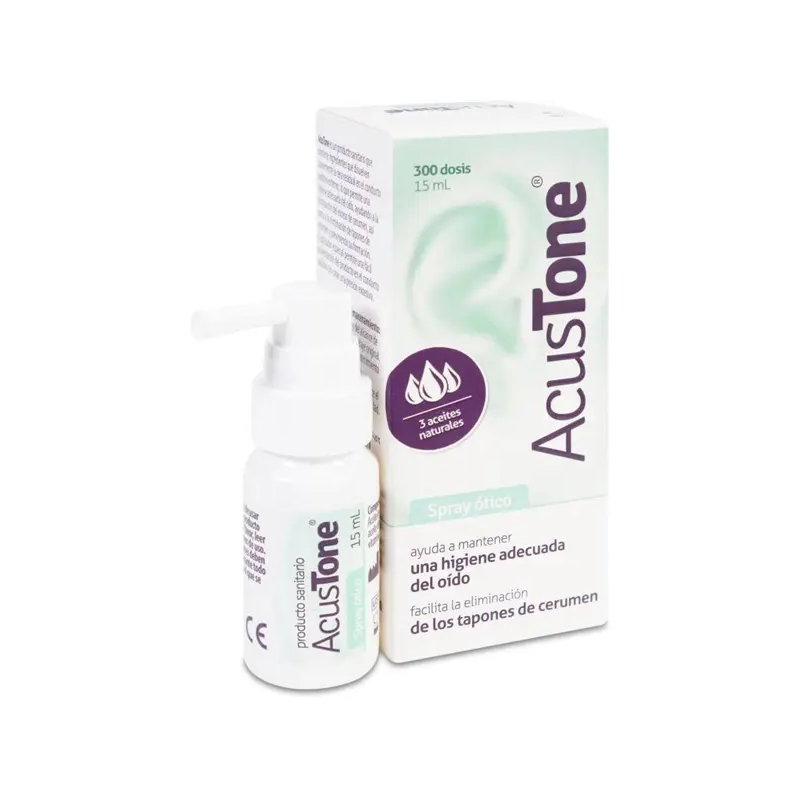 AcusTone Higiene del Oído Spray Ótico 15 ml es un producto diseñado para mantener una higiene adecuada del oído en adultos, niños y bebés mayores de 3 años. Su fórmula con 3 aceites naturales suaviza la cera acumulada, ayudando a facilitar la eliminación de tapones de cerumen de forma segura y delicada.