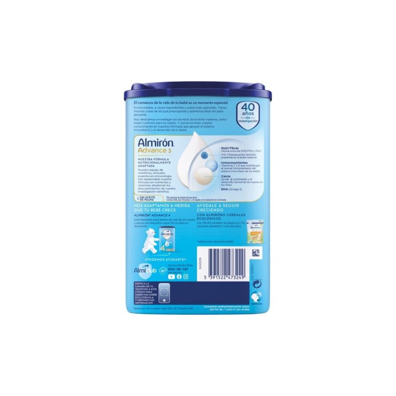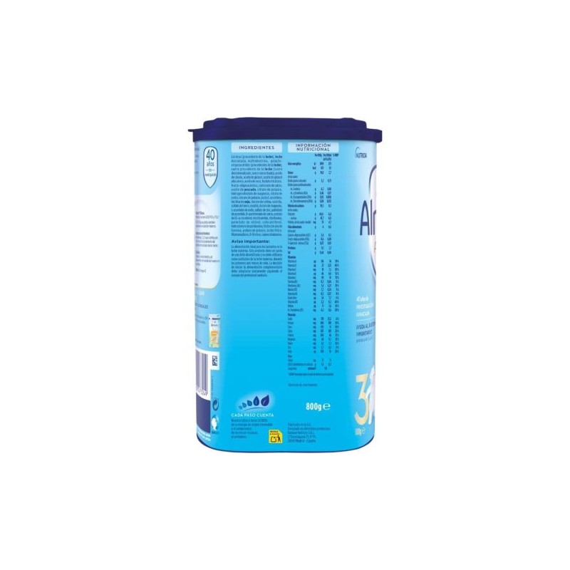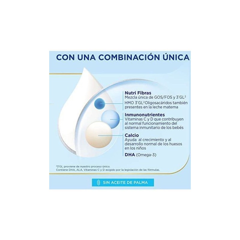 Lactosa (procedente de la leche), leche desnatada ,maltodextrina, galactooligosacaridos (procedentes de la leche), Producto de suero (suero desmineralizado, suero concentrado (prodecente de la leche)), aceite de palma, aceite de canela, aceite de girasol alto oleico, fosfato de caldo, aceite de coco, aceite de girasol, fructo-oligosacaridos, citrato de potasio, hidrogenofosfato de dipotasio, aceite de pescado, hidrogenofosfato de magnesio, citrato de sodio, cloruro de potasio, ácido L-ascórbico, emulsificante (lecitina de soja), cloruro de colina, aroma de vainilla, sulfato ferroso, inositol, cloruro de magnesio, L-ascorbato de sodio, sulfato de zinc, L-Carnitina, ascorbo palmitato D-pantotenato de calcio, acetato de DL-a-tocoferol, carbonato de calcio, nicotinamida, riboflavina, DL-a-tocoferol, palmitato de retinol, hidrocloruro de piridoxina, colecalciferol, hidrodoruro de tiamina, yoduro de potasio, ácido fálico, fitomenadiona, D-Biotina. cianocobalamina.