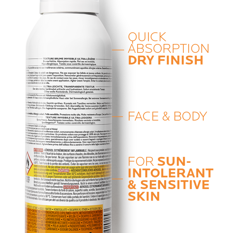 Esta bruma invisible tiene una textura ligera y de rápida absorción que se adapta a todo tipo de piel, incluso a la piel sensible. Su aplicación en bruma permite una distribución uniforme y una protección invisible, sin dejar residuos ni sensación pegajosa en la piel.