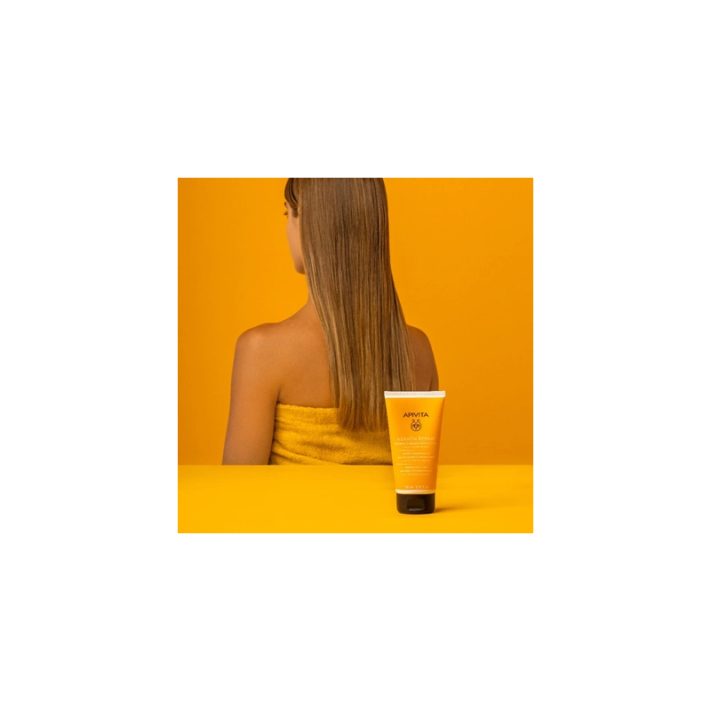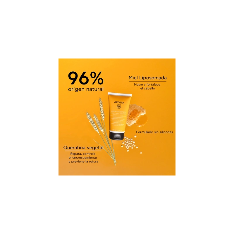 Apivita Acondicionador Capilar Keratin Repair 150 ml es un tratamiento reparador diseñado para reconstruir y fortalecer el cabello dañado o frágil, devolviéndole su suavidad, elasticidad y brillo natural. Su fórmula combina queratina vegetal, miel orgánica y aceites nutritivos que actúan directamente sobre la fibra capilar para repararla desde el interior.