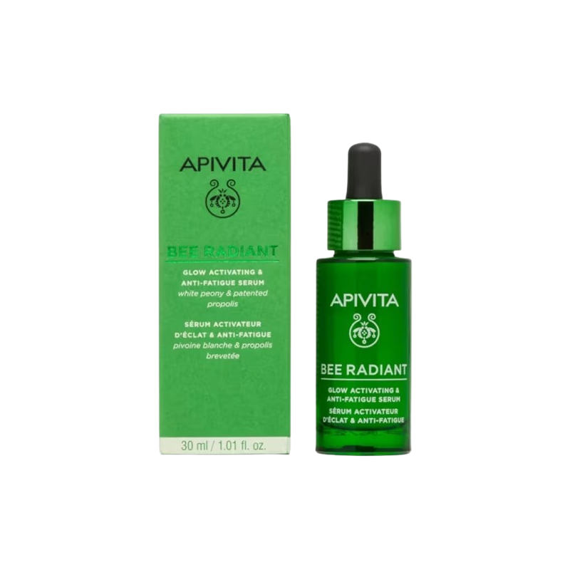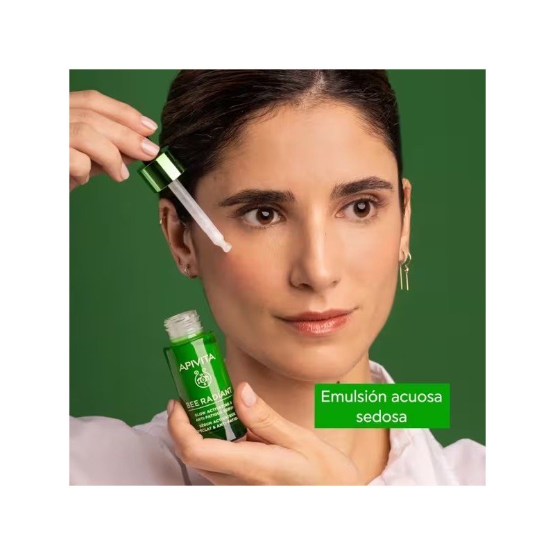 Bee Radiant Serum Iluminador de Apivita es un tratamiento intensivo que combina vitamina C, polifenoles de propóleo y células madre de naranja para combatir los signos del envejecimiento prematuro, iluminar el rostro y mejorar la textura de la piel visiblemente desde las primeras aplicaciones.