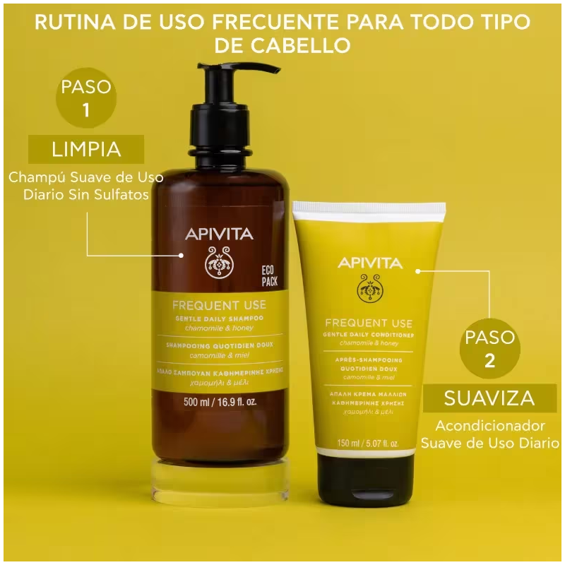 El champú de uso frecuente de APIVITA combina el poder suavizante de la camomila con las propiedades hidratantes de la miel para ofrecer una limpieza eficaz y respetuosa con el cuero cabelludo. Su fórmula equilibrada está diseñada para mantener el cabello sano, ligero y brillante incluso con lavados diarios.