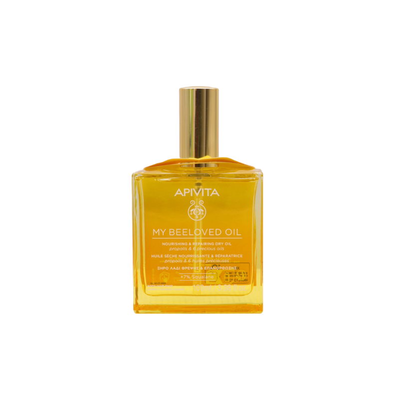 Apivita My Beeloved Oil es un aceite seco multifunción que combina el poder nutritivo de 5 aceites vegetales (almendra, oliva, girasol, jojoba y semilla de uva) con un 100% de ingredientes naturales. Su fórmula rica en antioxidantes hidrata en profundidad, mejora la elasticidad y deja la piel suave, luminosa y con un delicado aroma floral y meloso.