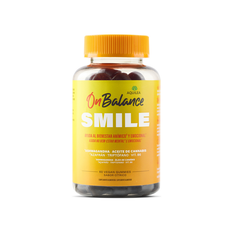 Aquilea OnBalance Smile 60 gominolas sabor cítrico es un suplemento innovador formulado para favorecer un estado de ánimo positivo y promover el bienestar emocional de forma natural. Su combinación de ingredientes seleccionados científicamente ayuda a afrontar el día con mayor energía y optimismo, combatiendo la fatiga mental y emocional. Contiene L-triptófano , un aminoácido esencial precursor de la serotonina, conocido como la “hormona de la felicidad”, que contribuye a la regulación del humor y del sueño, ayudando a mantener una actitud positiva ante los desafíos diarios.
