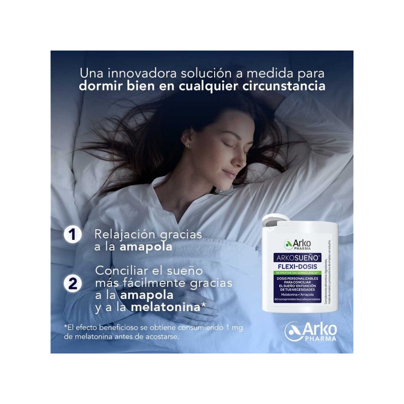 Arkosueño Flexi-Dosis 60 comprimidos sublinguales es un complemento de acción rápida a base de melatonina y extracto de amapola para ayudar a dormir.