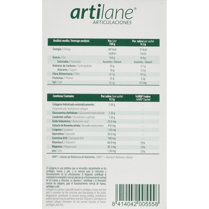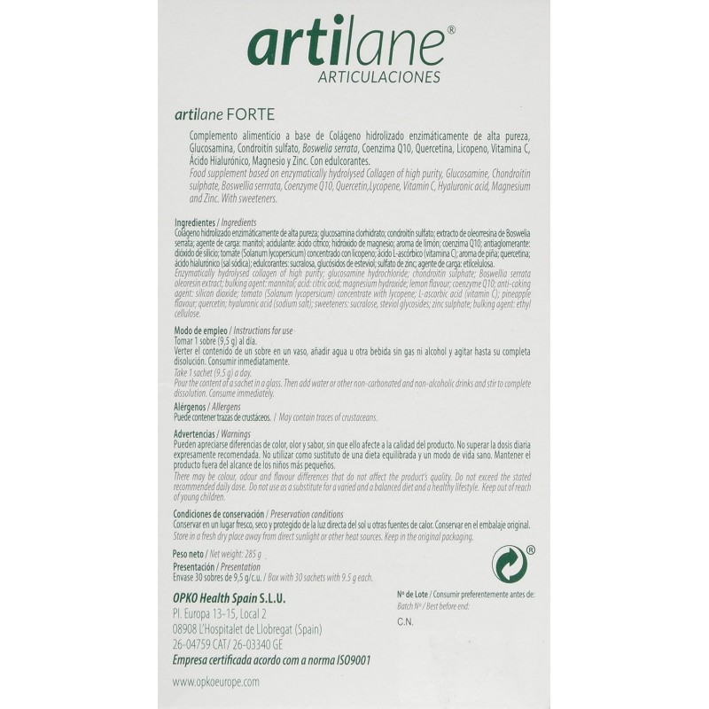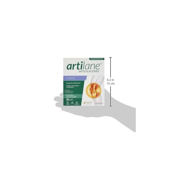 Más informaciónArtilane Forte en presentación de 30 sobres es un suplemento nutricional avanzado formulado para proporcionar un cuidado intensivo de las articulaciones. Cada sobre contiene una combinación de colágeno hidrolizado, ácido hialurónico, magnesio, vitamina C y otros antioxidantes que trabajan en sinergia para mantener la estructura y función del cartílago, mejorar la lubricación articular, reducir la inflamación y proteger contra el daño oxidativo. Ideal para personas con un alto nivel de actividad física, deportistas o aquellos que buscan un apoyo extra para sus articulaciones, Artilane Forte ofrece una forma conveniente y efectiva de mantener la salud articular.
