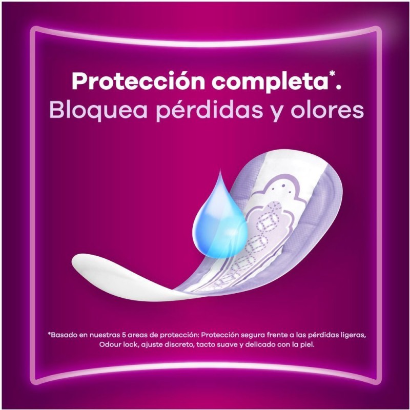 Compresas para pérdidas de orina. Con barreras protectoras que ayudan a evitar fugas. En bolsitas individuales, se puede utilizar la bolsita para desechar la compresa una vez usada. Exclusivo doble núcleo que ayuda a bloquear la humedad y el olor durante horas.