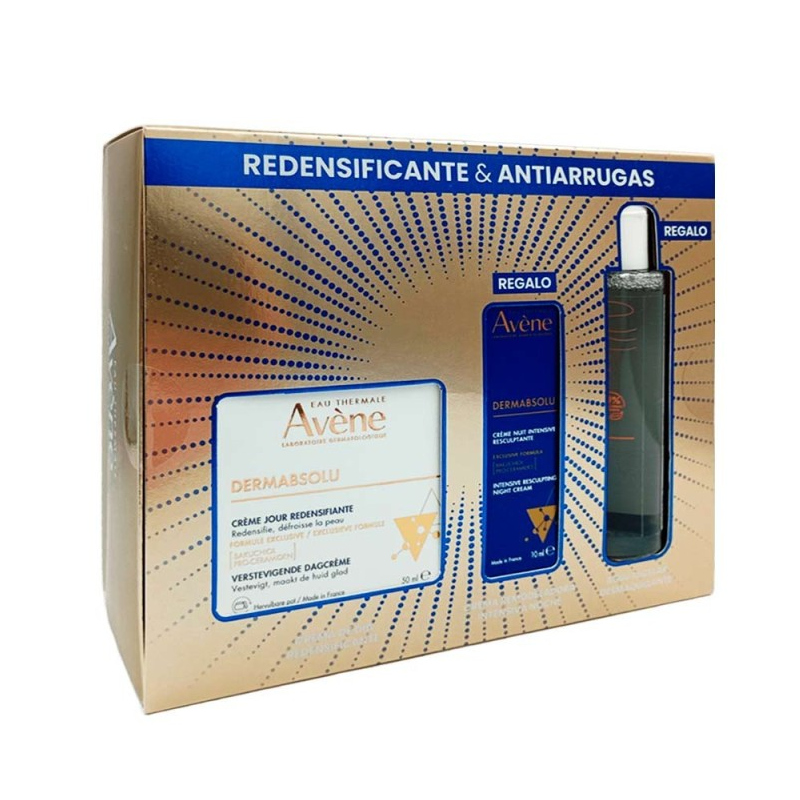 El AVENE PACK DermAbsolu es un ritual completo para la piel madura que busca firmeza, densidad y luminosidad. Su producto principal, la DermAbsolu Crema de Día, combina ingredientes innovadores como Vanilla Polyphenols, Glycoléol y el exclusivo Agua Termal de Avène, que ayudan a redefinir el óvalo facial, mejorar la elasticidad y fortalecer la barrera cutánea.