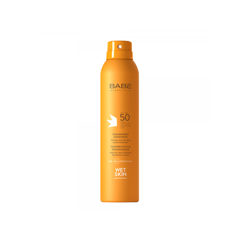 BABÉ Fotoprotector Wet Skin Transparente SPF 50 (200 ml) es un spray solar corporal de alta protección que se puede aplicar sobre piel seca o mojada sin perder eficacia, lo que lo convierte en un aliado ideal para la playa o la piscina.