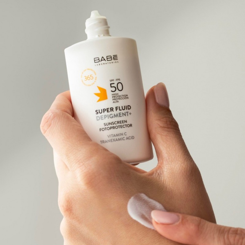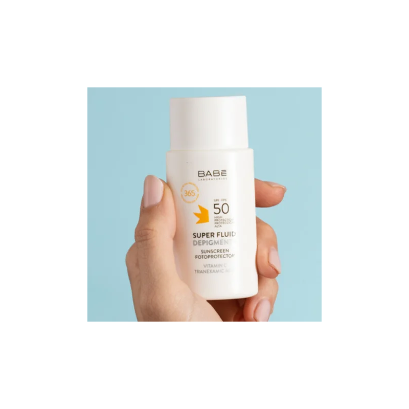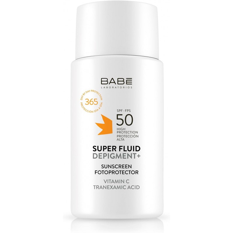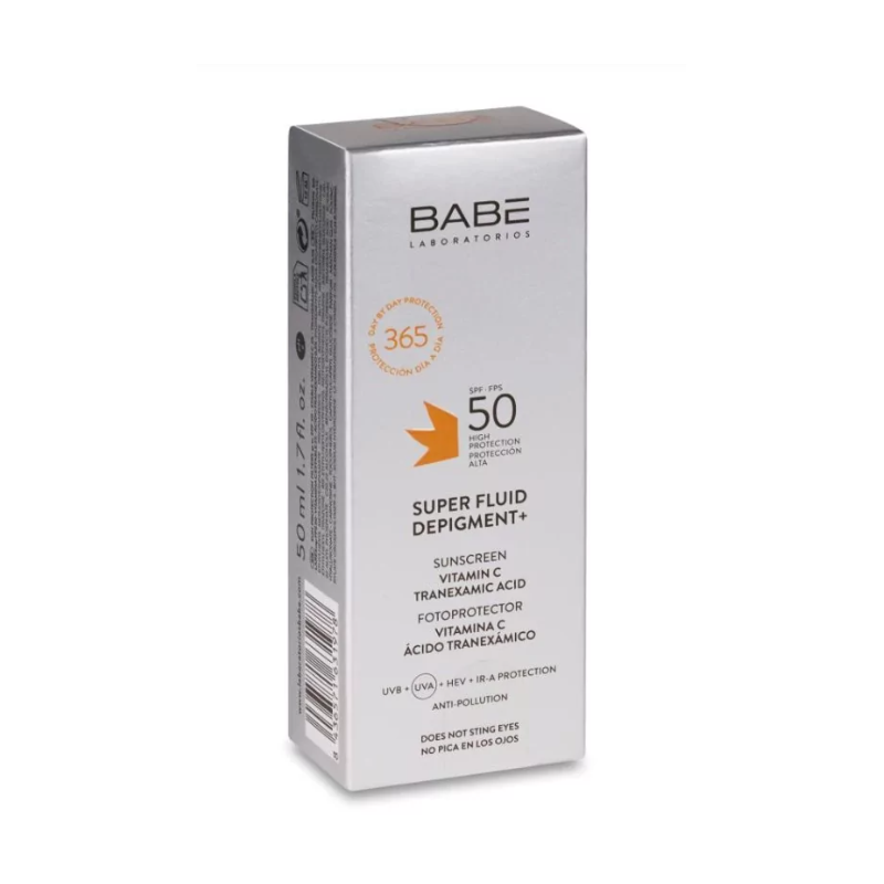 Más informaciónBABÉ Super Fluid Depigment+ SPF 50 es un fotoprotector facial antimanchas que combina alta protección solar frente a los rayos UVA, UVB, IR-A y luz azul, con activos despigmentantes para prevenir y tratar las hiperpigmentaciones de la piel. Su fórmula contiene ácido tranexámico, niacinamida y vitamina E, ingredientes clave para reducir la apariencia de manchas oscuras, igualar el tono y mejorar la luminosidad cutánea.