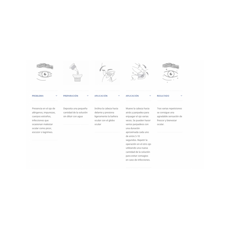 - limpieza ocular en casos de exposición a agentes externos que causan irritación, picor y molestias como pueden ser el humo, alérgenos, cloro de piscinas, aire acondicionado, polución, ambientes cargados, etc.