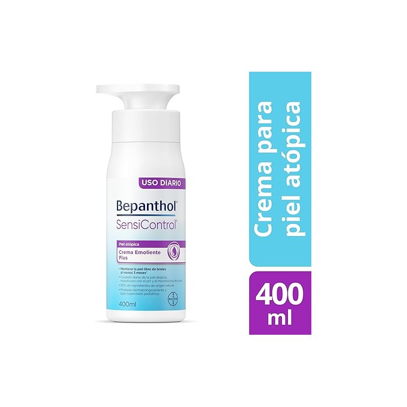 Bepanthol SensiControl Crema Emoliente Plus 400 ml es una crema de uso diario especialmente formulada para el cuidado de pieles sensibles y con tendencia atópica. Su exclusiva fórmula Derma-defense refuerza las defensas naturales de la piel, ayudando a mantenerla sana y protegida. Enriquecida con un prebiótico que estimula la microflora cutánea de defensa, vitamina B3 (niacinamida), pro-vitamina B5 (pantenol) y aceites naturales como el aceite de oliva y el aceite de espino amarillo, esta crema proporciona una hidratación profunda y duradera. Además, su tecnología de lípidos laminares potencia la barrera protectora de la piel desde el interior. Está dermatológicamente testada y es apta para su uso en bebés, niños y adultos.