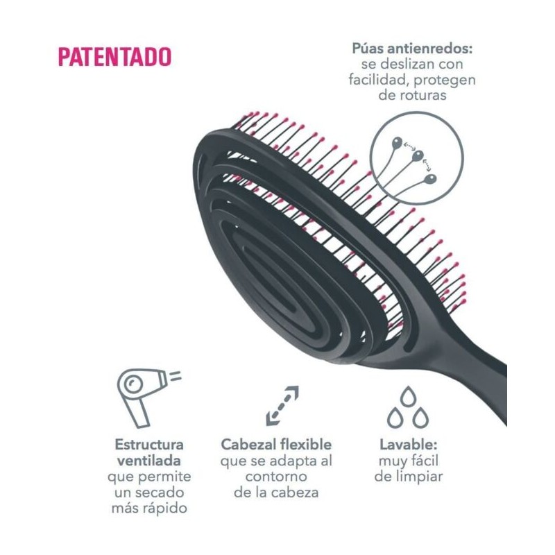 Su diseño patentado permite desenredar y secar el cabello con mayor rapidez, ya que su estructura ventilada favorece la circulación del aire durante el secado con secador. Las púas antienredos se deslizan con suavidad tanto en cabello húmedo como seco, ayudando a minimizar la rotura y el daño capilar.