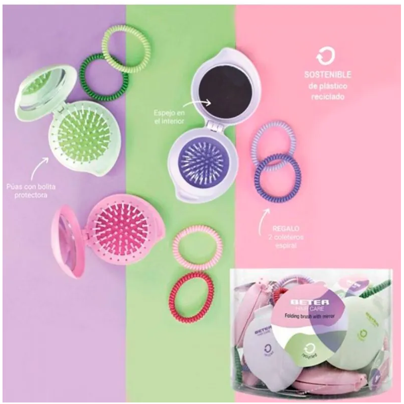 Más informaciónEl cepillo redondo de viaje Beter está diseñado para ofrecer comodidad y funcionalidad en cualquier momento del día. Su formato plegable incluye un espejo integrado, lo que permite retocar el peinado o maquillaje de forma rápida y sencilla estés donde estés. Además, incorpora un coletero extra que facilita recoger el cabello en caso de necesidad. Su diseño compacto y ligero lo convierte en un imprescindible para llevar en el bolso, mochila o neceser, asegurando que siempre tengas a mano las herramientas básicas para cuidar tu imagen.