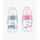 Biberón con tetina de látex Talla M (flujo medio) para bebés de 0 a 6 meses, con sistema anticólicos y diseño ergonómico.