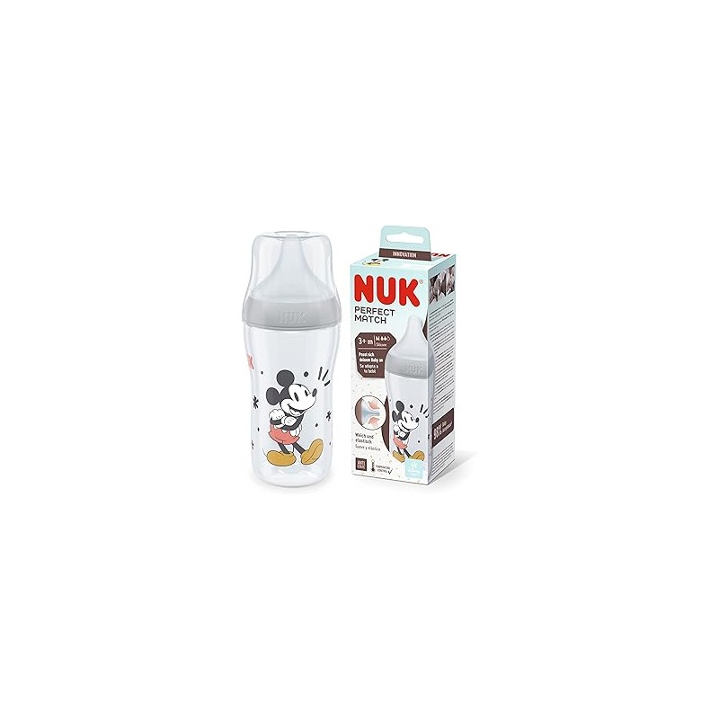 El Biberón PP Silicona NUK Perfect Match Flujo M de 260 ml, con diseño de Mickey en color gris, es una excelente opción para padres que buscan un biberón seguro y eficaz para la alimentación de sus bebés, proporcionando comodidad y reduciendo los cólicos durante cada toma.