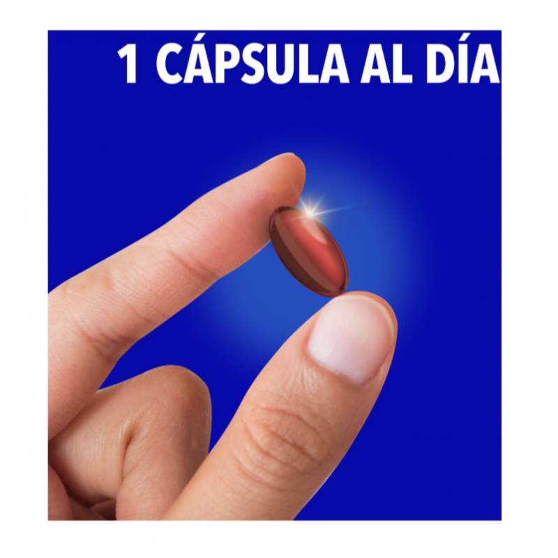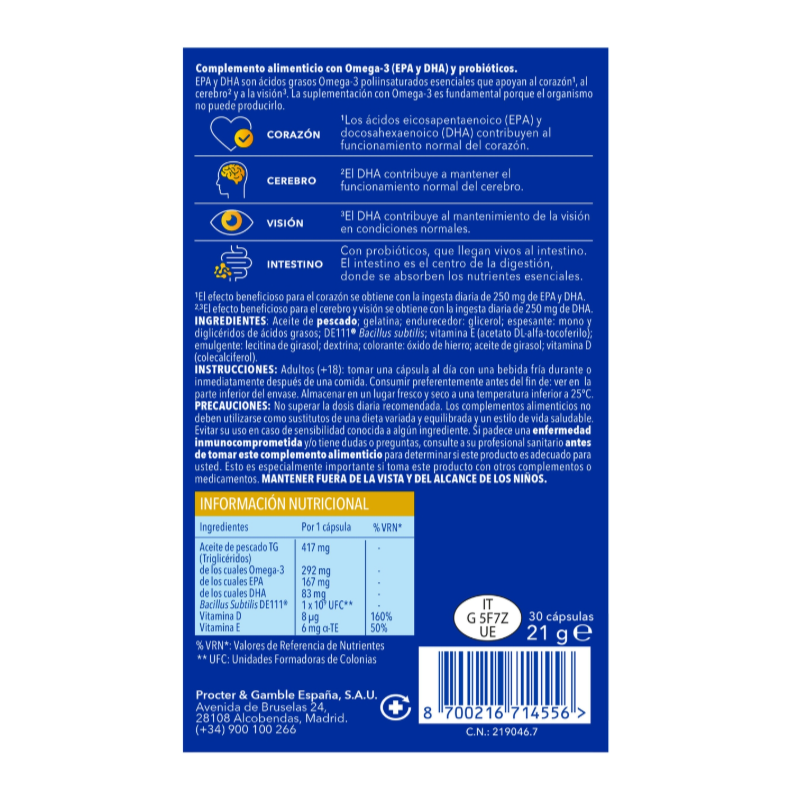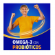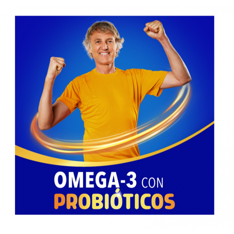 Complemento alimenticio con Omega 3 (EPA y DHA) que apoyan al corazón, al cerebro y a la visión, y también incluye probióticos para fortalecer el intestino.