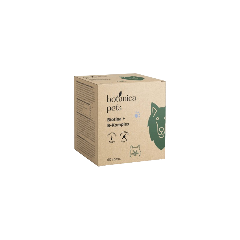 Leer másBiotina B Complex de BotánicaPets es un suplemento alimenticio formulado con biotina y un complejo equilibrado de vitaminas del grupo B, diseñado para apoyar la salud de la piel, el pelaje y las uñas de perros y gatos. La biotina contribuye a mejorar la calidad del pelo, reducir la caída y favorecer un crecimiento más fuerte y brillante. Además, las vitaminas B1, B2, B6 y B12 ayudan al metabolismo energético, al sistema nervioso y a la regeneración celular. Es ideal para mascotas con pelaje apagado, muda excesiva o sensibilidad cutánea. Presentado en envase de 60 comprimidos masticables, con sabor agradable para facilitar su administración diaria.