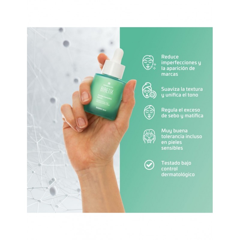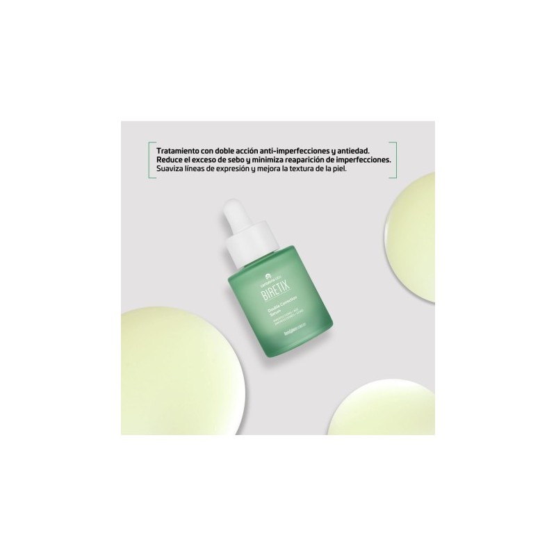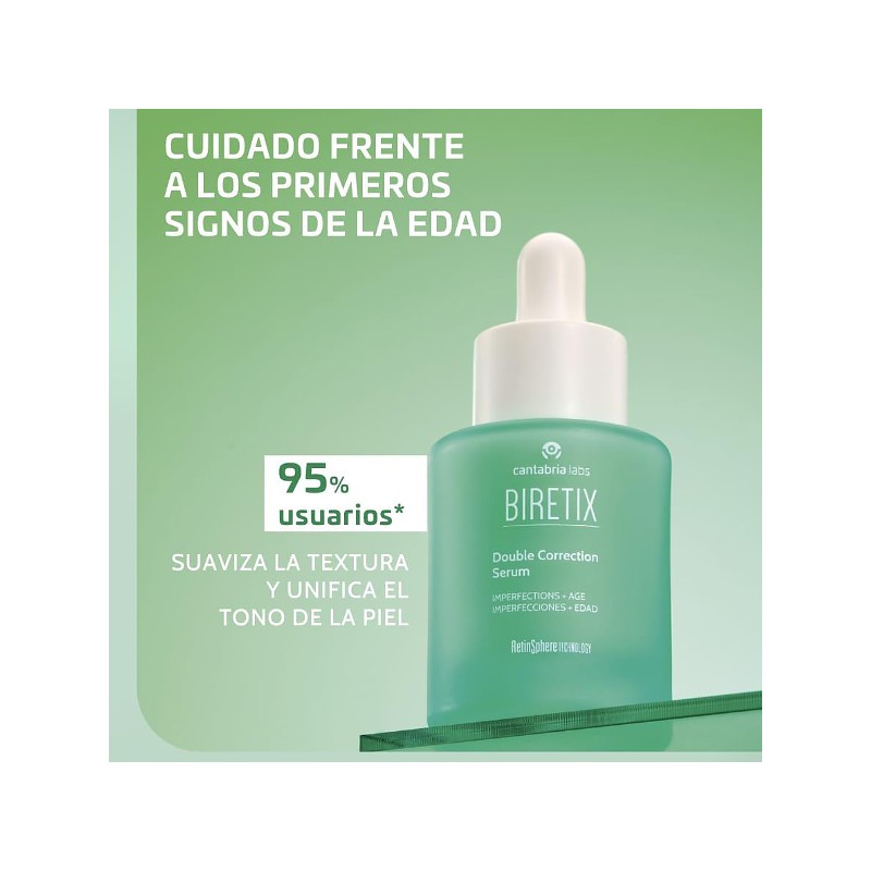 Más informaciónBiretix Double Correction Sérum Imperfecciones + antiedad 30 ml es un tratamiento avanzado formulado específicamente para pieles adultas con tendencia acneica. Combina potentes activos como ácido glicólico, niacinamida y retinoides encapsulados que actúan en sinergia para tratar brotes, refinar poros, mejorar la textura y aportar luminosidad al rostro, mientras previenen y corrigen los signos del envejecimiento cutáneo.