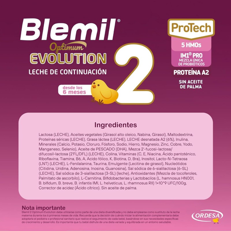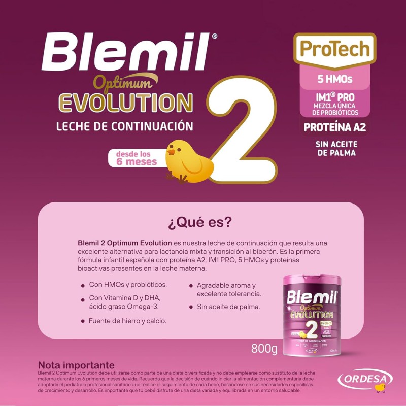 Más informaciónBlemil Optimum Evolution 2 800 g es una leche de continuación diseñada para bebés a partir de los 6 meses, ideal para acompañar su crecimiento cuando se comienza a introducir la alimentación complementaria. Su fórmula avanzada se inspira en la leche materna e incorpora los últimos progresos en nutrición pediátrica para ofrecer una nutrición completa, segura y de alta tolerancia.