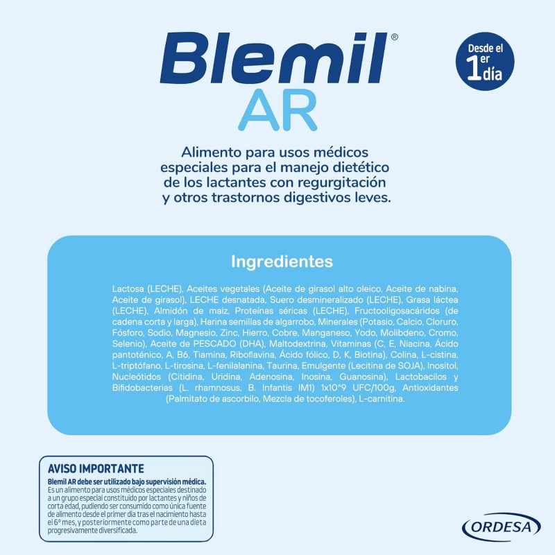 Más informaciónBlemil Plus AR 800 g es una fórmula especialmente diseñada para lactantes con tendencia a la regurgitación, ayudando a disminuir la devolución del alimento gracias a su contenido en agentes espesantes de alta calidad. Su composición está cuidadosamente desarrollada para proporcionar una nutrición completa y equilibrada, contribuyendo al adecuado crecimiento y desarrollo del bebé desde los primeros días de vida.