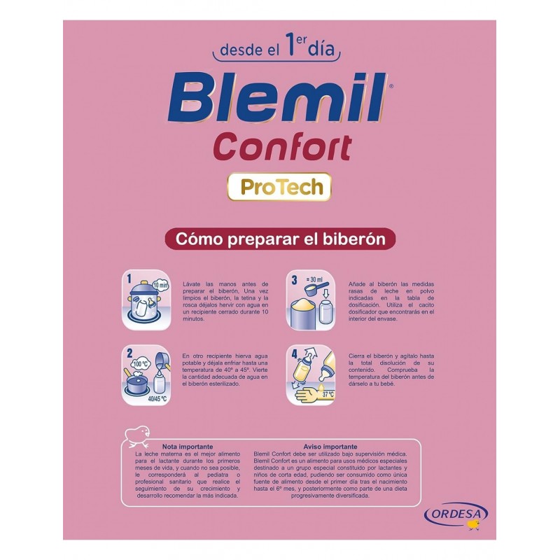 Desde Sanafarmacia te recomendamos lavarse bien las manos y esterilizar los utensilios antes de preparar el biberón. Posteriormente, calentar agua hasta unos 40ºC. Añadir la cantidad de agua indicada en la tabla de dosificación. Incorporar las medidas rasas de polvo correspondientes (1 cacito = 4,5 g). Agitar hasta que la mezcla sea homogénea. Comprobar la temperatura antes de ofrecer al bebé. Usar inmediatamente tras la preparación y desechar el sobrante.