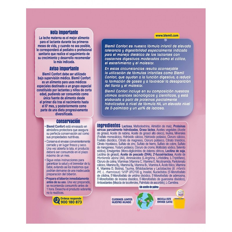 Más informaciónBlemil Plus Confort 800 g es una fórmula para lactantes desarrollada para cubrir las necesidades nutricionales del bebé desde el nacimiento, especialmente en situaciones donde existe malestar digestivo, como cólicos, gases, estreñimiento, regurgitaciones leves o sensibilidad intestinal.