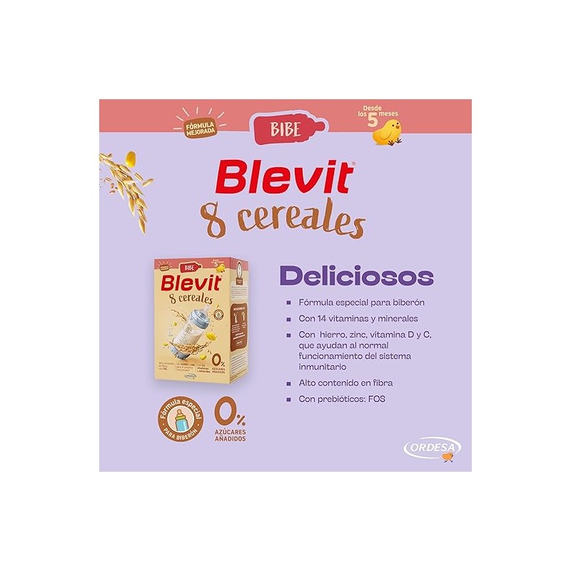 Blevit Bibe 8 Cereales 500 g es una papilla instantánea de cereales solubles, enriquecida con vitaminas y minerales, que aporta energía y nutrientes esenciales para el crecimiento del bebé. Ideal para añadir directamente al biberón desde los 6 meses.
