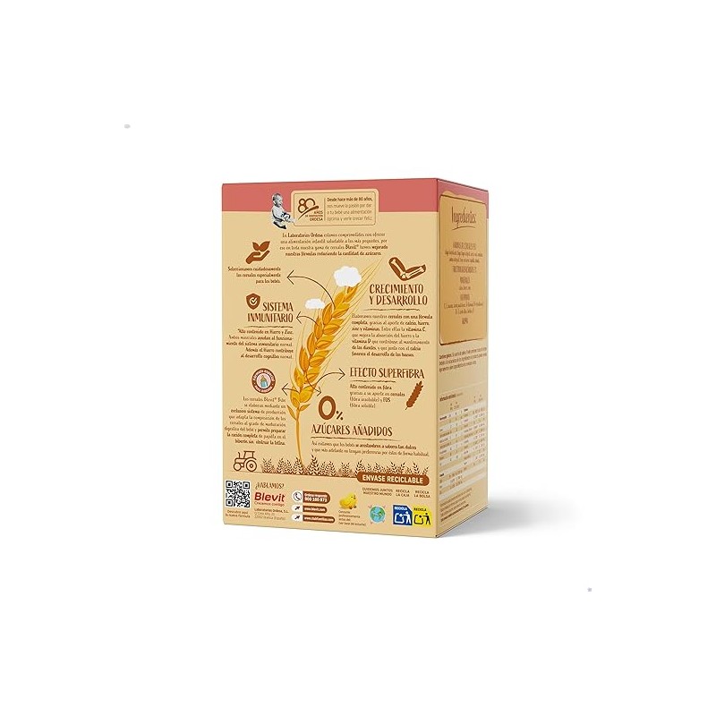 La papilla Blevit Bibe 8 Cereales está elaborada a partir de una mezcla equilibrada de 8 cereales (trigo, arroz, avena, cebada, maíz, centeno, mijo y sorgo) cuidadosamente seleccionados y tratados mediante un proceso de hidrólisis enzimática, que facilita la digestión y mejora la absorción de los nutrientes.