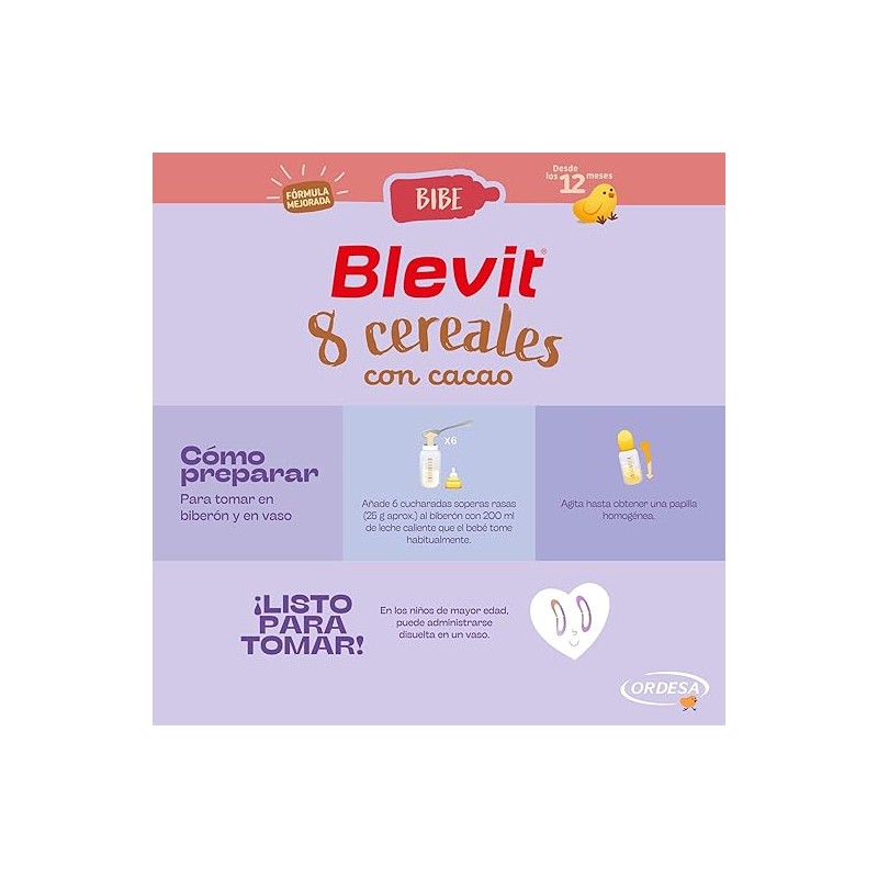 Más informaciónLa papilla Blevit Bibe 8 Cereales Cacao combina una mezcla equilibrada de 8 cereales (trigo, arroz, avena, cebada, maíz, centeno, mijo y sorgo) con cacao natural, ofreciendo un sabor suave y agradable que ayuda a diversificar la dieta del bebé.