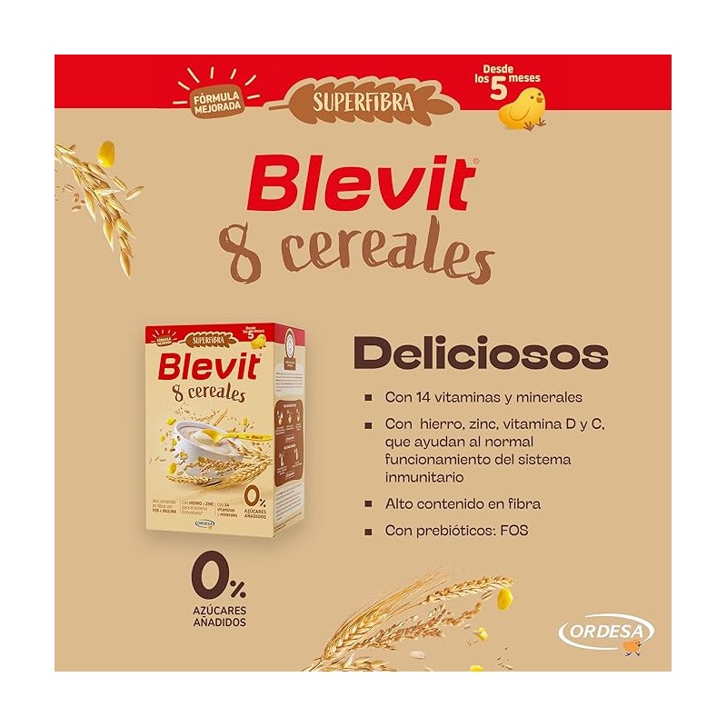 Blevit Super Fibra 8 Cereales 500 g es un alimento infantil completo, diseñado para favorecer una digestión saludable en los más pequeños, aportando energía y nutrientes esenciales mediante una mezcla de ocho cereales integrales.