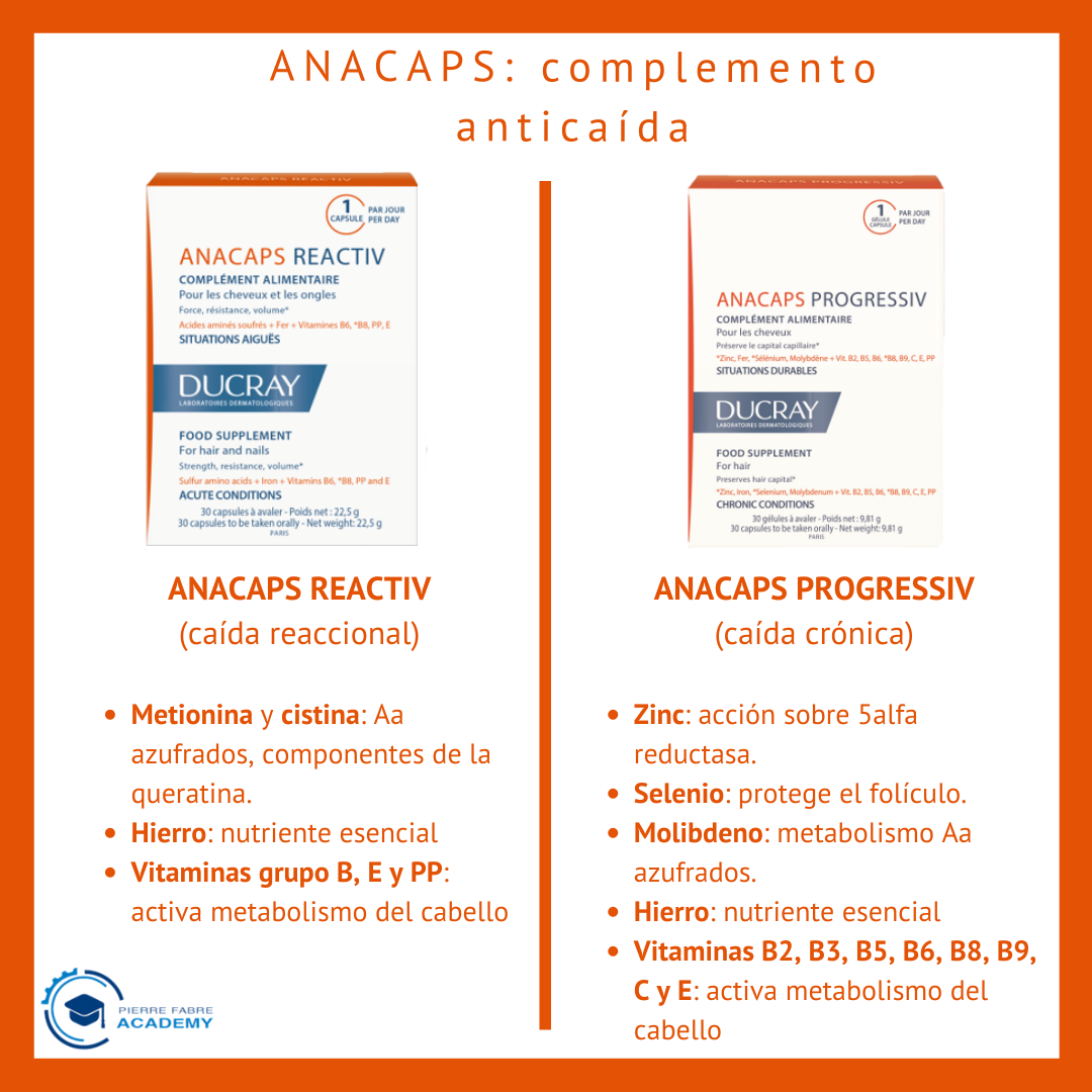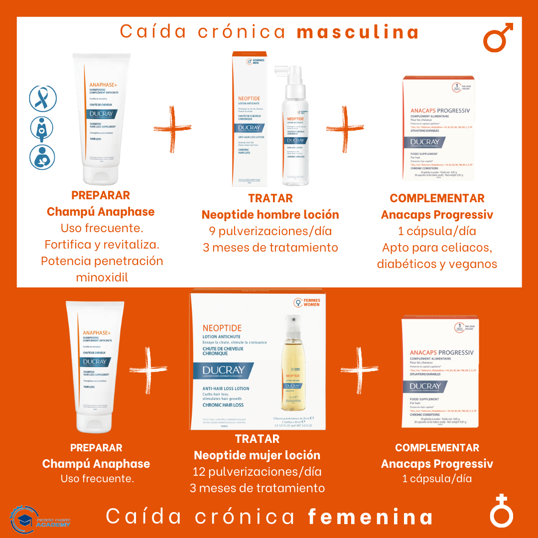 Ducray dispone de NEOPIDE hombre o NEOPIDE mujer, loción anticaída progresiva que contiene principios activos que estimulan y activan la microcirculación sanguínea de la base del cabello, con lo que conseguimos frenar la caída y mantener la densidad capilar desde las primeras fases de la caída. La loción puede complementarse con ANAPHASE +, champú estimulante que prepara el cuero cabelludo para recibir la loción y que se absorba mejor. Por último, el complemento alimenticio ANACAPS PROGRESSIV vía oral para la caída crónica del cabello, que incorpora entre sus principios activos el zinc que actúa regulando en su fórmula elementos esenciales para favorecer el crecimiento del cabello fuerte y sano.