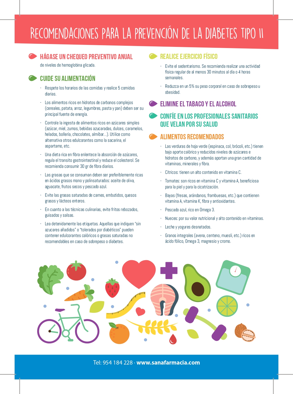 Tras el diagnóstico de DM2, se establecerá un plan de tratamiento individual para conseguir controlar tanto los niveles de azúcar en sangre como los factores de riesgo y así evitar que la enfermedad avance o que aparezcan complicaciones. El equipo de farmacéuticos de Sanafarmacia te dará información para manejar la enfermedad y mejorar tu calidad de vida, te harán recomendaciones sobre alimentación saludable, ejercicio físico y prácticas para controlar la diabetes. Si tomas algún medicamento antidiabético nuestros profesionales podrán resolver tus dudas sobre: para qué es el medicamento, cuánto tienes que tomar, cómo tienes que tomarlo o durante cuánto tiempo, cómo tienes que conservarlo o qué hacer si experimentas algún tipo de problema cuando empieces a utilizarlo.