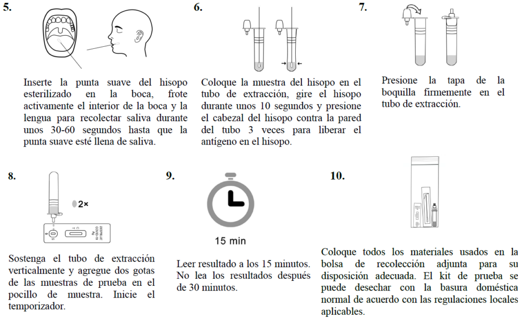 Este producto se utiliza para la detección cualitativa in vitro del antígeno SARS-CoV-2 en una muestra de saliva humana y está diseñado para la autocomprobación en casa como una prueba rápida para detectar una infección por el nuevo coronavirus, aunque el diagnóstico final debe realizarlo el personal médico basándose en los resultados de laboratorio y el análisis de síntomas.
