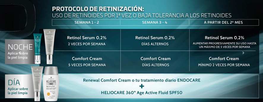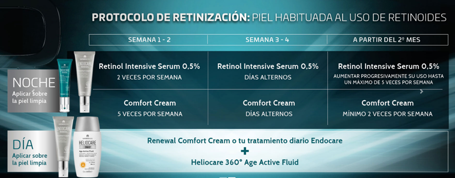 - ENDOCARE RENEWAL RETINOL INTENSIVE SERUM: sérum de textura anhidra. Contiene 0,5% Retinol Puro en Microesponjas. Aplicar por la noche sobre la piel limpia del rostro de forma progresiva y según la tolerancia de acuerdo al régimen de Renewal o instrucciones de su prescriptor.