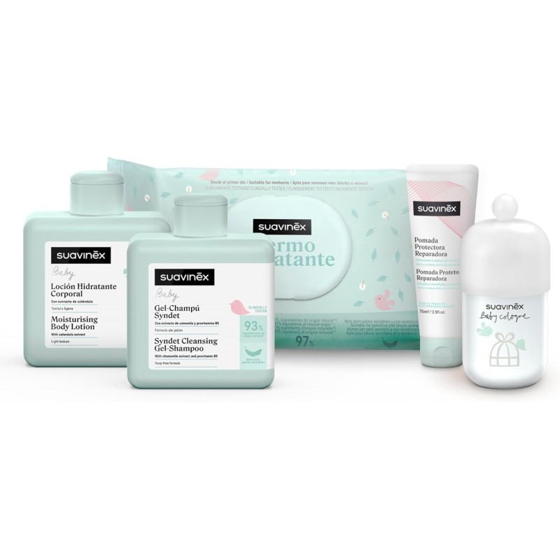 Este neceser incluye: Gel Champú Syndet 300 ml + Loción Hidratante 300 ml + Pomada Pañal 50 ml + Baby Cologne 100 ml + Toallitas 60 uds.