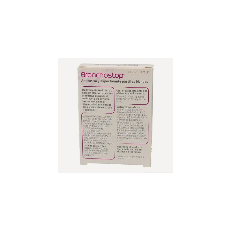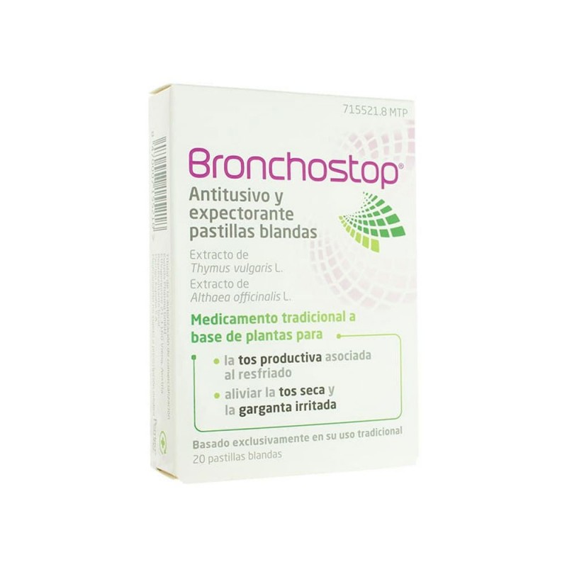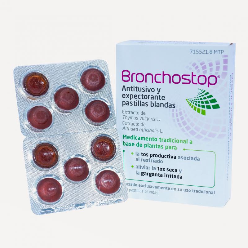 Más informaciónBRONCHOSTOP® Antitusivo y expectorante, pastillas blandas es un medicamento tradicional a base de plantas, indicado para el alivio de la tos asociada al resfriado, tanto seca como productiva. Su fórmula combina extractos naturales con una larga tradición de uso, proporcionando un efecto calmante, protector y expectorante.