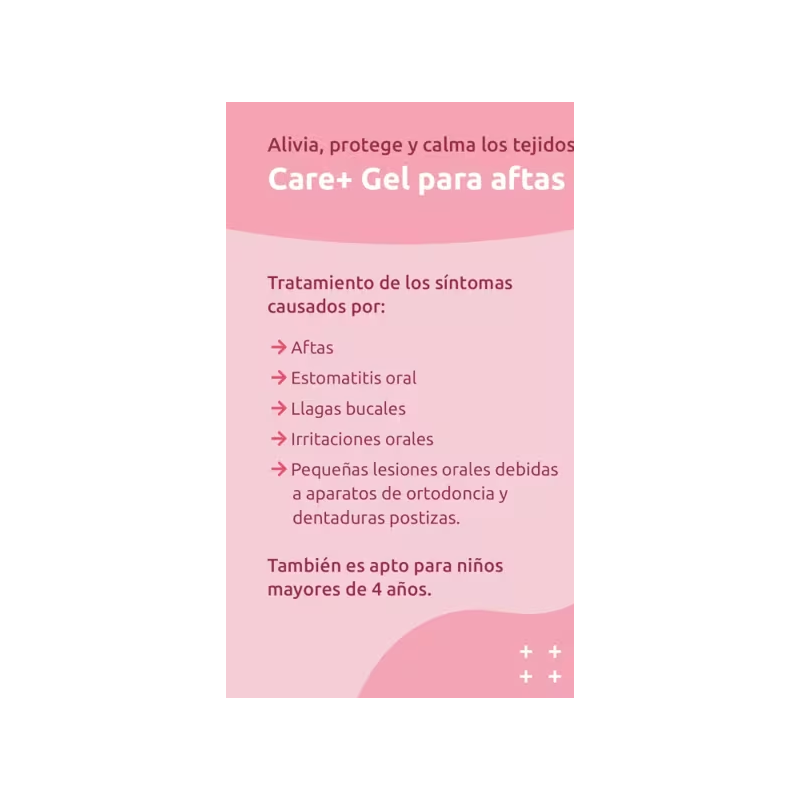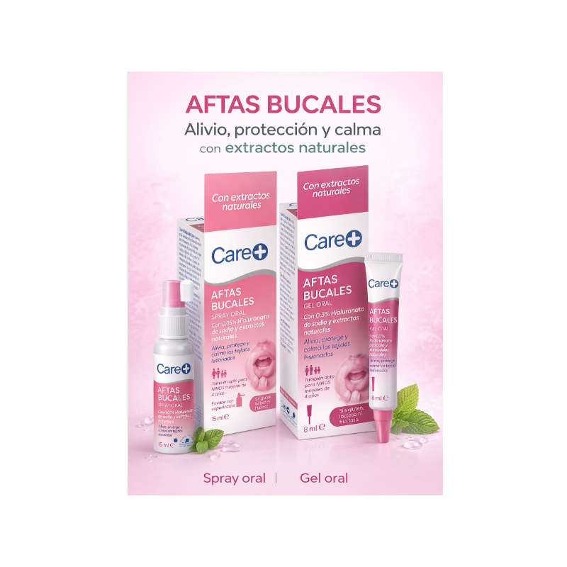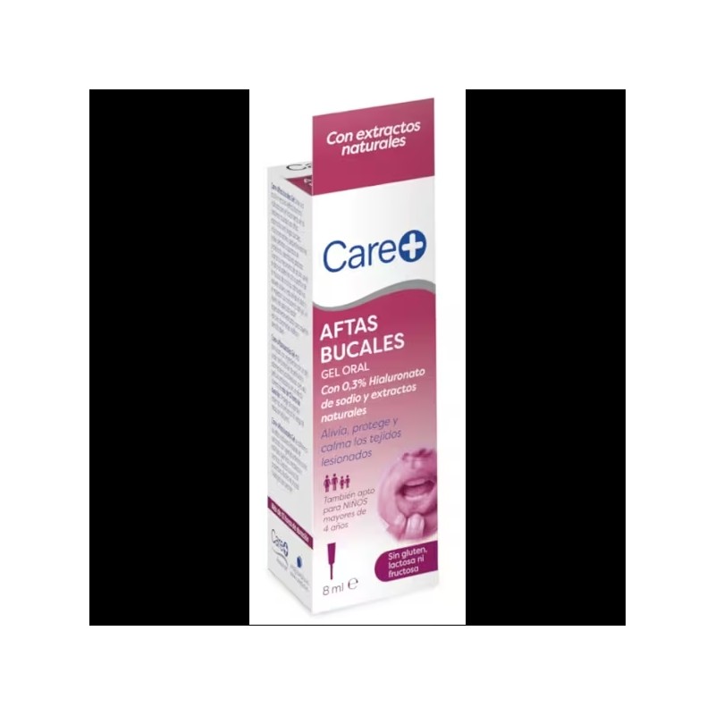 Care+ Aftas Bucales Gel Oral es un gel de uso oral formulado para aplicarse directamente sobre zonas concretas de la mucosa bucal. Contiene 0,3 % de hialuronato de sodio, junto con extractos naturales como aloe y althea, conocidos por su uso tradicional en productos de cuidado bucal.