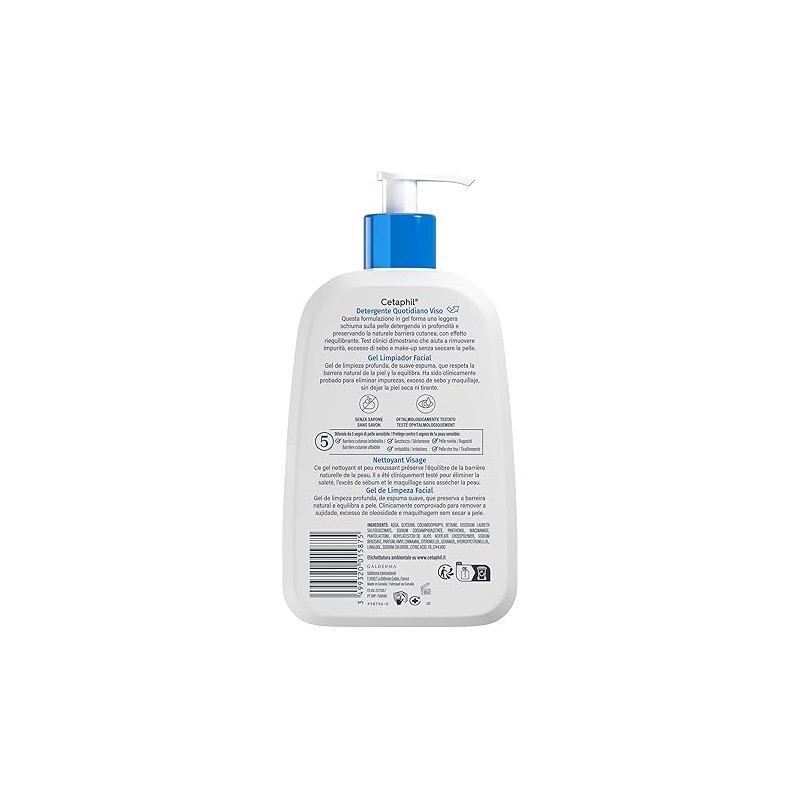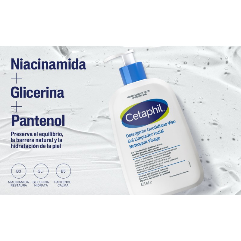 Más informaciónCETAPHIL Gel Limpiador Facial para Piel Sensible Mixta/Grasa está formulado para ofrecer una limpieza profunda sin comprometer la barrera protectora de la piel. Elimina eficazmente el exceso de grasa, impurezas y restos de maquillaje, ayudando a mantener el rostro fresco y equilibrado. Su fórmula incorpora glicerina, que contribuye a mantener la hidratación; niacinamida, conocida por su acción reequilibrante y suavizante; y pantenol, que aporta confort a la piel. Esta combinación ayuda a limpiar sin resecar, respetando el equilibrio natural cutáneo. Además, ayuda a minimizar la apariencia de los poros y a mejorar el aspecto general de la piel, dejándola suave y con sensación de frescor. Está clínicamente probado y oftalmológicamente testado, lo que lo hace apto incluso para pieles sensibles.