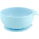 Pack de accesorios de alimentación para bebés, en suave silicona azul, que incluye plato, babero y cuchara.