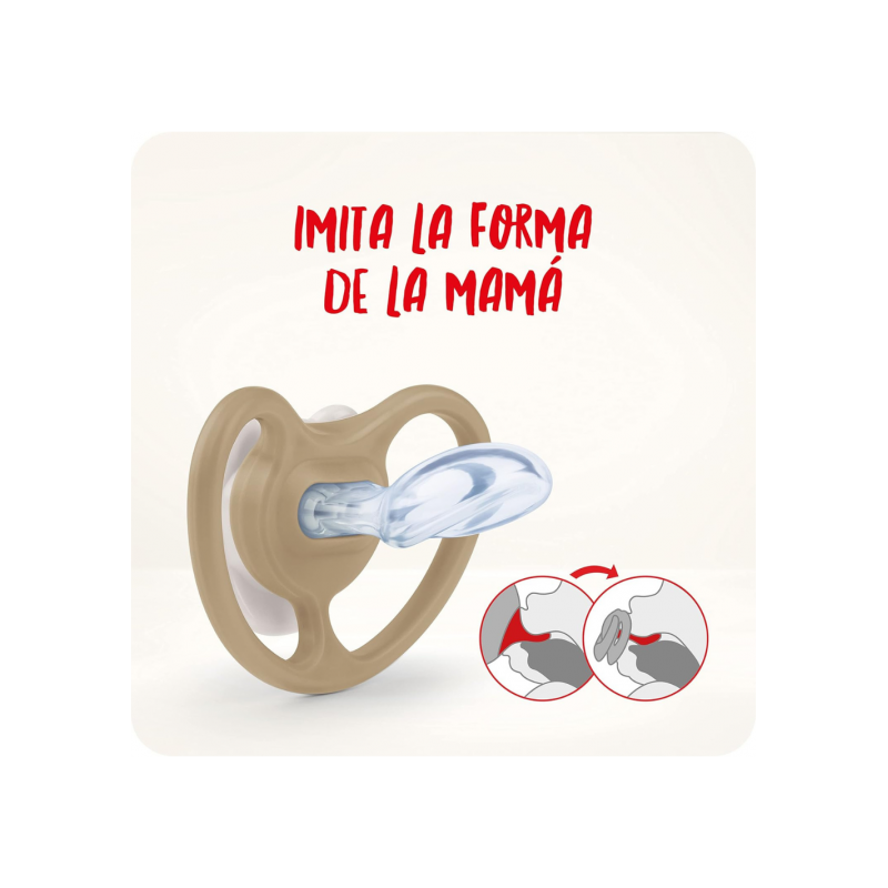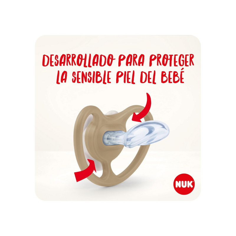 La forma anatómica de la tetina se adapta al paladar y mandíbula del bebé, respetando su desarrollo natural. El diseño Space incorpora ilustraciones de animales, aportando un toque divertido y encantador. Incluye el sistema NUK Air System, que permite la salida del aire de la tetina para mantener su flexibilidad y suavidad, reduciendo la presión sobre dientes y encías.
