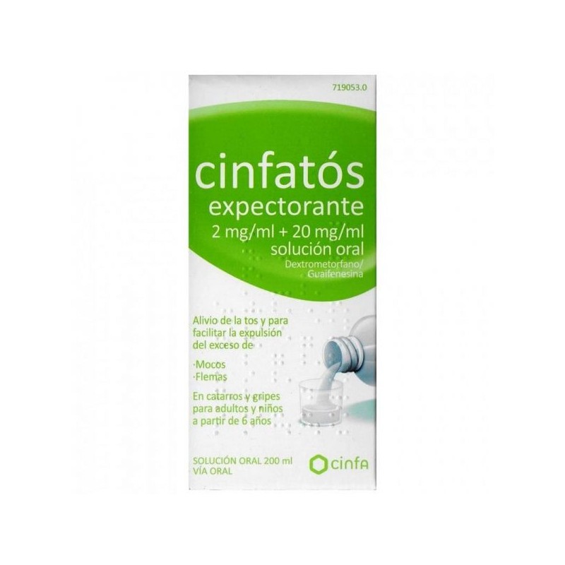 Más informaciónCinfatos Expectorante es un tratamiento en solución oral (jarabe) para aliviar la tos productiva y ayudar a expulsar mucosidad y flemas de las vías altas. Formulado con dextrometorfano que hidrobromuro alivia la tos bloqueando el reflejo cerebral que la provoca y guaifenesina que actúa reduciendo la viscosidad de las secreciones y facilitando la expulsión de mocos y flemas.