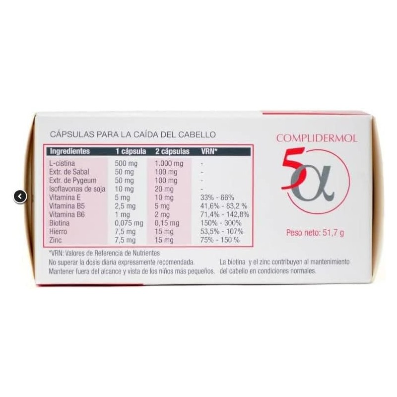 Más informaciónComplidermol 5 Alfa 60 Cápsulas es un tratamiento oral anticaída formulado para nutrir y fortalecer el cabello desde la raíz, combatiendo eficazmente la caída capilar tanto en hombres como en mujeres. Su combinación de aminoácidos, vitaminas, minerales y extractos naturales actúa directamente sobre el folículo piloso, ayudando a frenar la caída y estimular el crecimiento de un cabello más fuerte, denso y saludable.