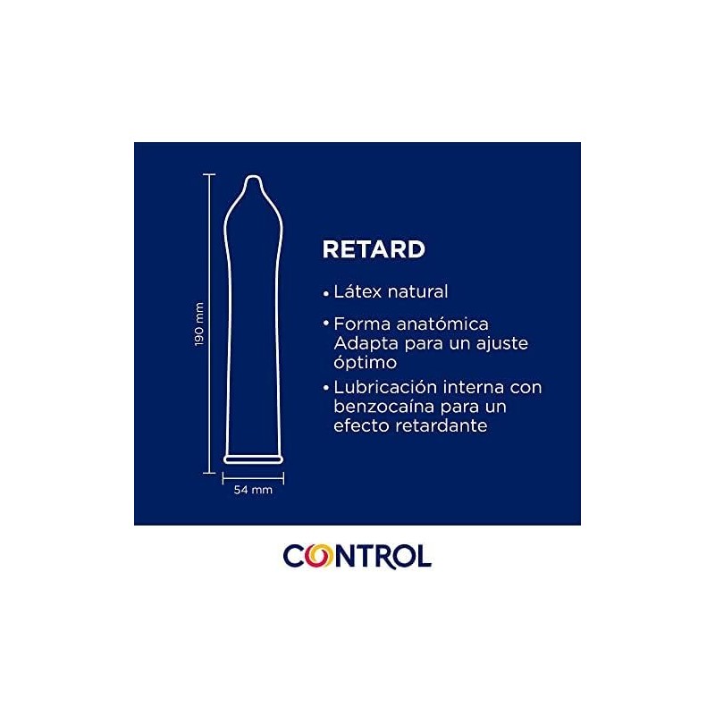 Preservativos con efecto retardante para prolongar el placer y disfrutar de relaciones más intensas. Con Control Retard vivirás momentos más largos, placenteros y seguros.
