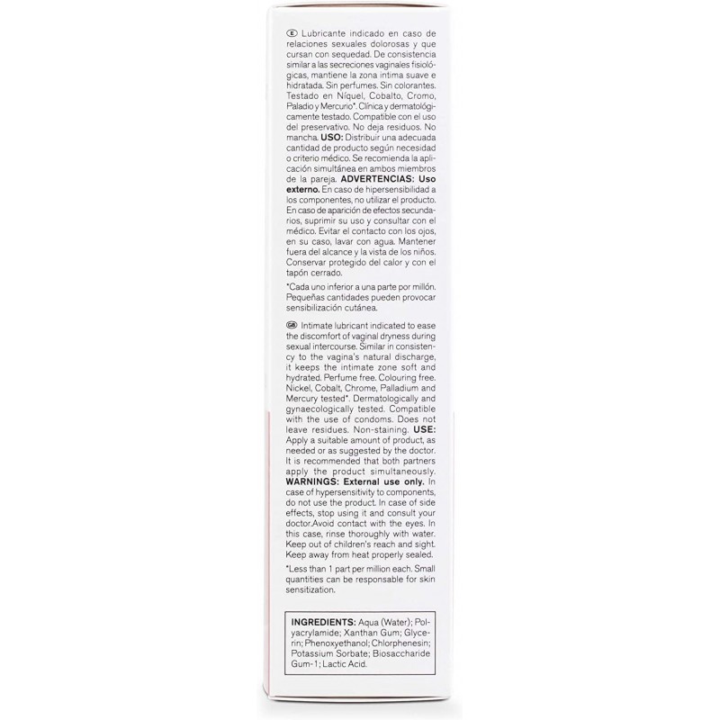 No contiene perfumes ni colorantes. Testado en níquel, cobalto, cromo, paladio y mercurio. Clínica y dermatológicamente testado. Compatible con el uso de preservativo.