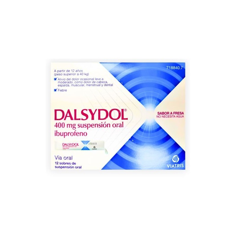 Más informaciónDalsydol 400 mg suspensión oral es un medicamento a base de ibuprofeno, un principio activo del grupo de los antiinflamatorios no esteroideos (AINEs), utilizado para el tratamiento sintomático de dolores leves o moderados (como cefaleas, dolores musculares, dentales o menstruales), así como para la reducción de la fiebre.