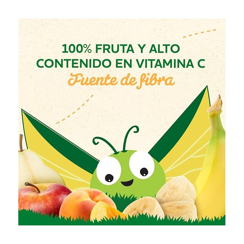 Pouch de frutas 100% natural con manzana, pera, plátano y albaricoque. Rico en vitamina C y fuente de fibra, ideal para una merienda saludable y práctica, para bebés y niños a partir de 6 meses.