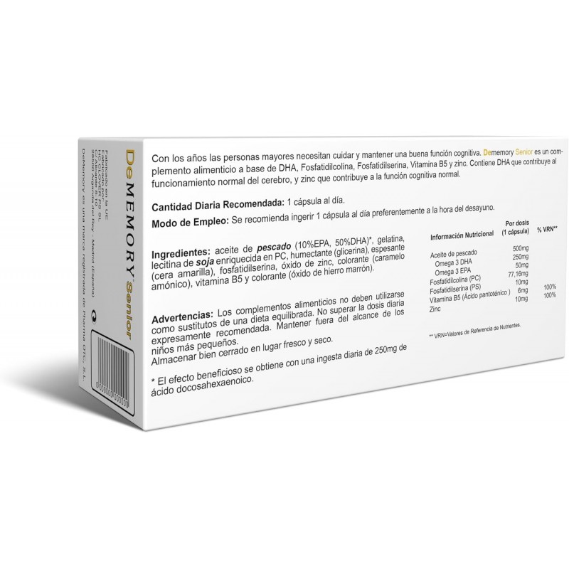 Dememory Senior 30 Cápsulas es un complemento alimenticio diseñado para apoyar el rendimiento mental y la memoria en personas mayores, gracias a su fórmula enriquecida con fosfatidilserina, vitaminas, minerales y antioxidantes esenciales.